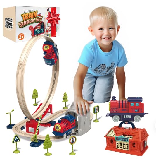Introducing the Train Toys for Toddlers 3-5 - Railway Station with Loop, Bridge & Signs! This Montessori educational train set is the perfect birthday gift for boys and girls aged 2-4, designed to spark creativity and imagination.